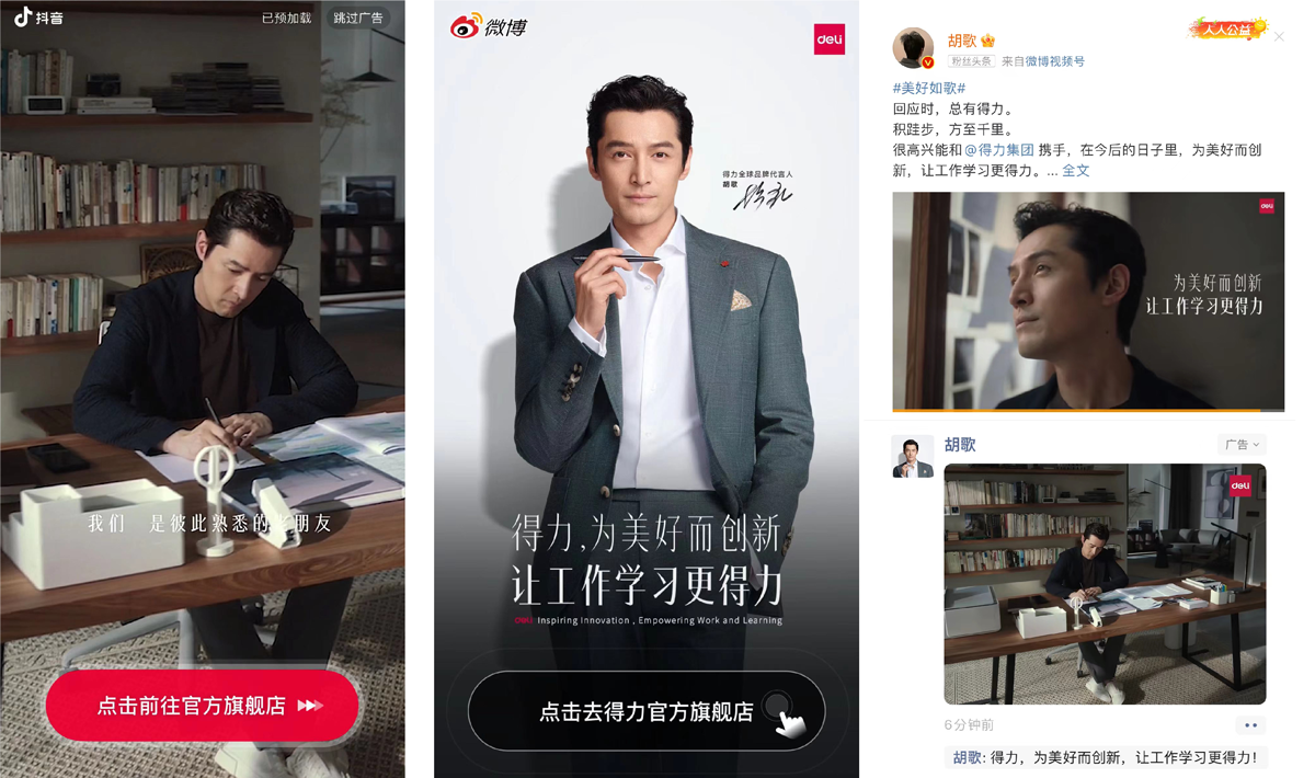 伴随着预热阶段悬念海报和悬念视频的陆续发布,成功激发起网友及社会公众好奇。零点之际,得力依托微博热搜话题,正式发布官宣代言人海报,微博全国开屏、大视窗等资源同步上线,微博、抖音、小红书、B站等全媒体平台联动。随后,胡歌以代言人身份,在微博平台带话题“与日俱新 美好如歌”发布首支合作TVC,与7000万微博粉丝共享这一官宣时刻。与此同时,杭州西湖天幕、成都太古里大屏等线下大屏将陆续上线,引爆代言官宣声量。